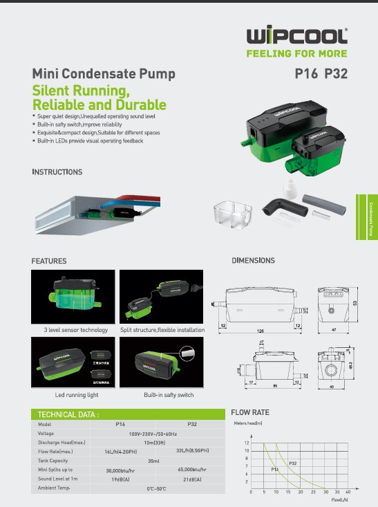 پمپ درین ویپکول (WIPCOOL) یک راهکار هوشمند، بیصدا و بسیار مؤثر برای تخلیه آب تقطیرشده از دستگاههای تهویه مطبوع است. این پمپها مخصوص سیستمهایی طراحی شدهاند که امکان تخلیه ثقلی آب وجود ندارد یا نصب در ارتفاع انجام شده و نیاز به هد پمپاژ بالا وجود دارد.